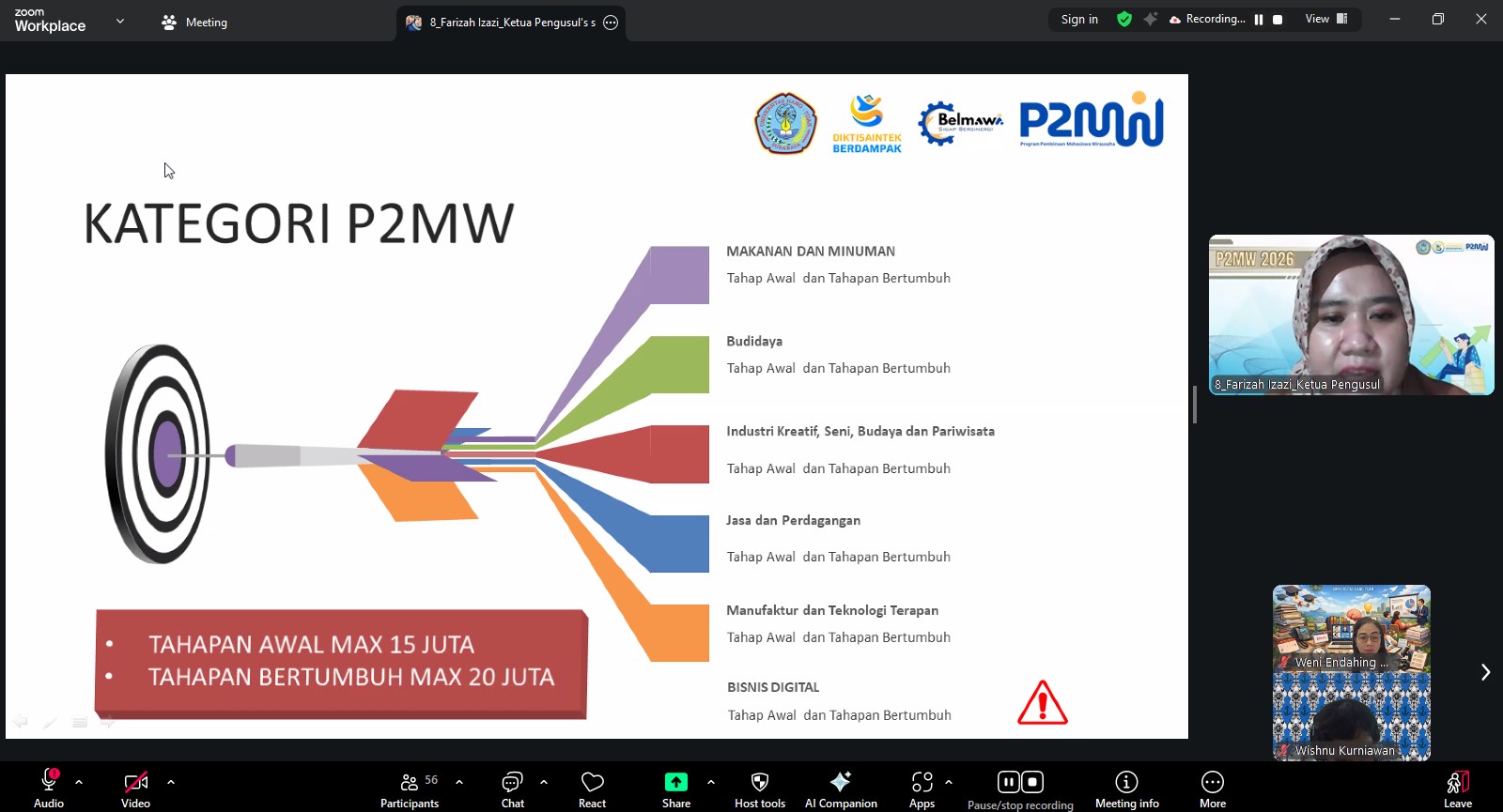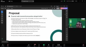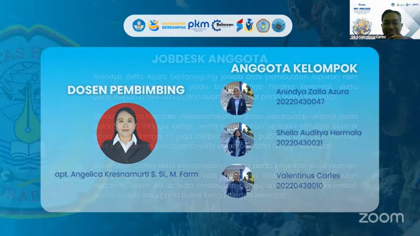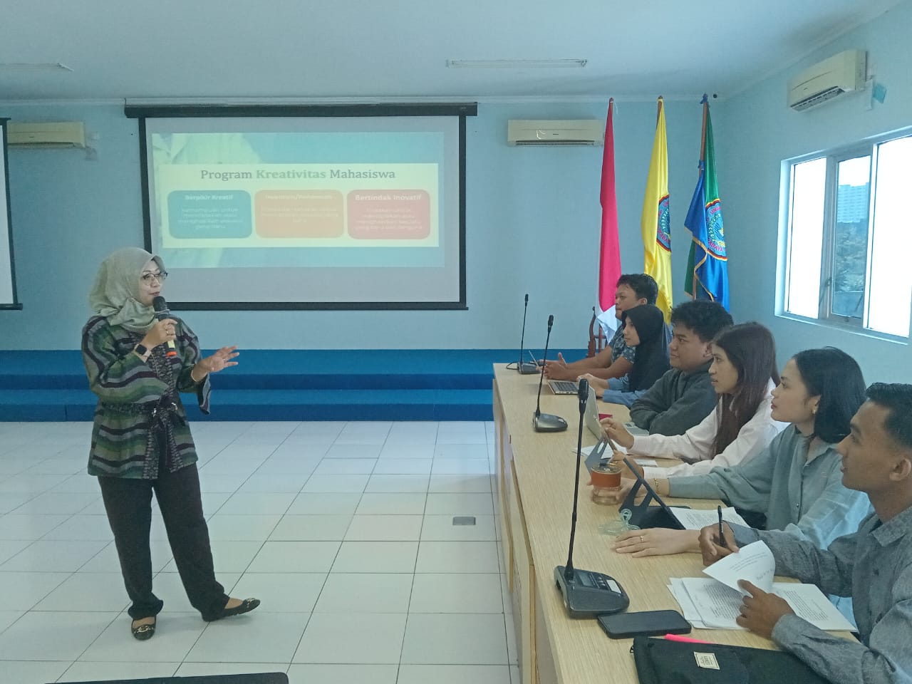 Pada hari Senin, tanggal 20 Oktober 2025, diadakan Webinar Pendampingan Monev Internal Program Kreativitas Mahasiswa, dengan pembimbing Bapak Wishnu Kurniawan, S.H., M.H. dan Mahmiah, S.Si., M.Si. penyusunan proposal yang harus mengacu pada salah satu dari 10 tema utama, pembentukan tim, dan mengikuti bimbingan teknis. Setelah itu, peserta perlu menyiapkan luaran kemajuan seperti laporan dan produk, serta akun media sosial untuk diunggah ke Simbelmawa sebelum batas waktu yang ditentukan untuk Penilaian Kemajuan Pelaksanaan (PKP2).