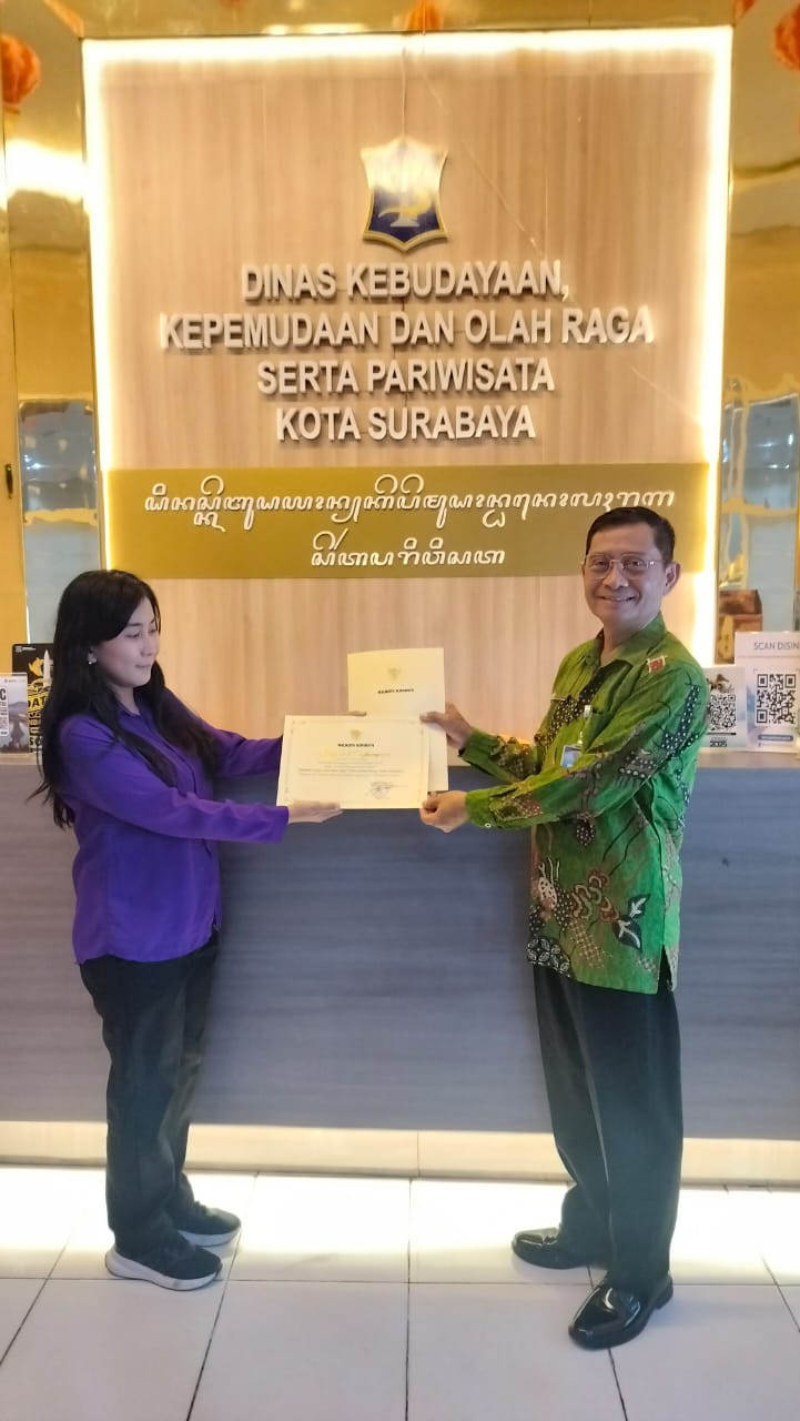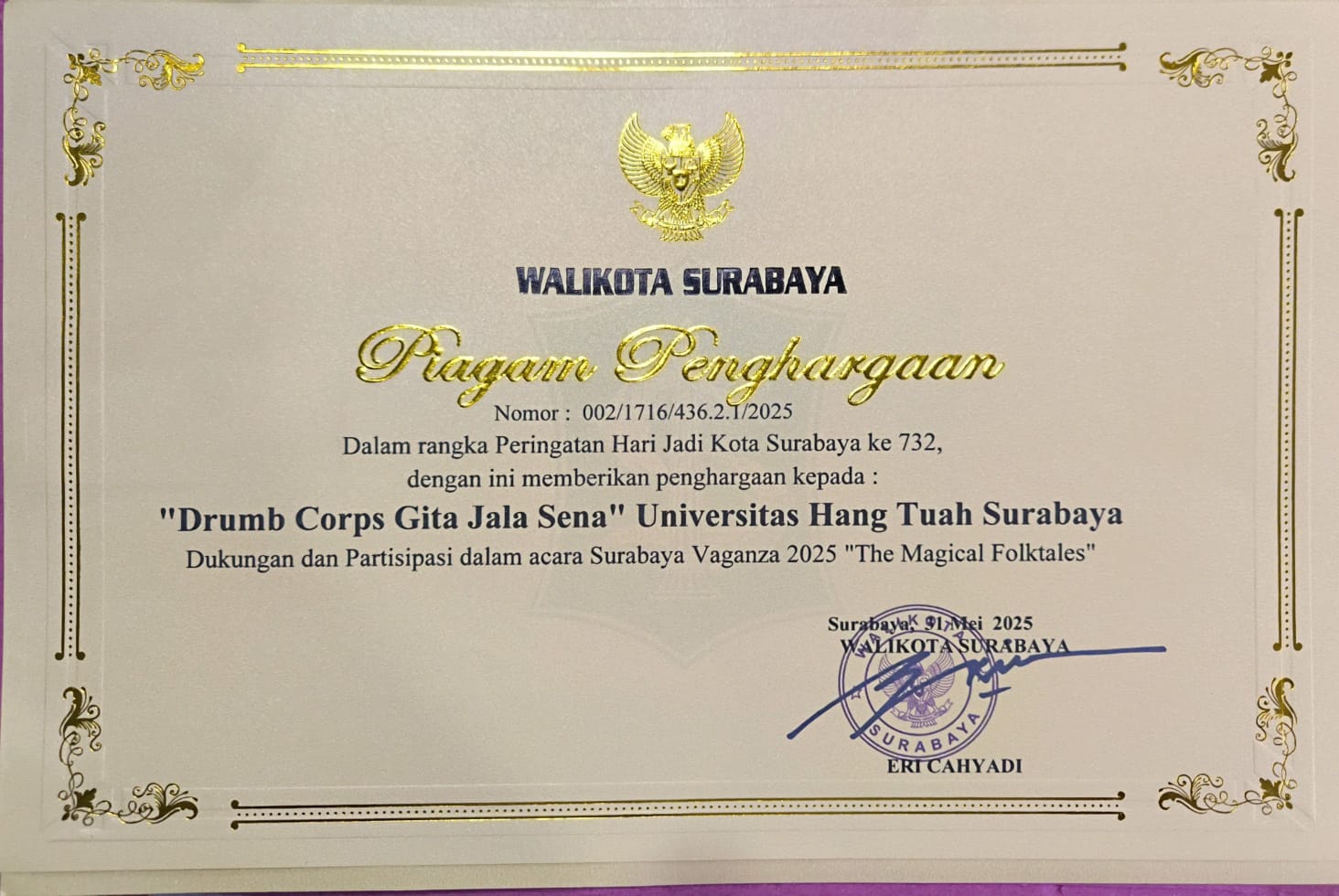Pada hari Jumat, Tanggal 20 Juni 2025 Ka. Biro Kemahasiswaan, Kemaritiman dan Alumni (BKKA) Bapak Budi Priyono, S.Sos., M.M., Dalam Rangka peringatan Hari Jadi Kota Surabaya Ke 732 Universitas Hang Tuah Surabaya Menerima Penghargaan dari Walikota Surabaya ” Drumb Corps Gita Jala Sena” dalam acara Surabaya Vaganza 2025 ” The Magical Folktales