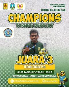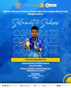 Pada hari Selasa tanggal 03 Mei 2025 Atlit Universitas Hang Tuah Tarung Derajat Mendapatkan Medali Perak Rumah Pomprov III Jatim An. Tegar Prasetyo nim 20220410090 dari Fakultas Kedokteran