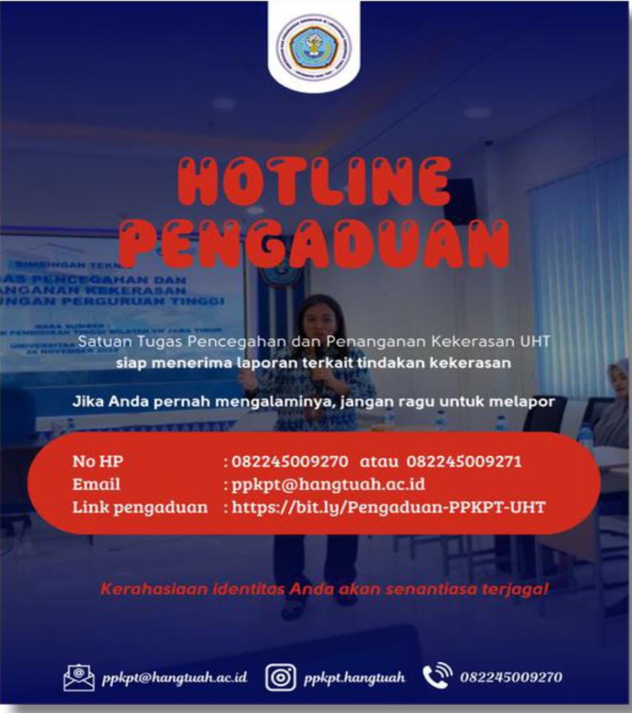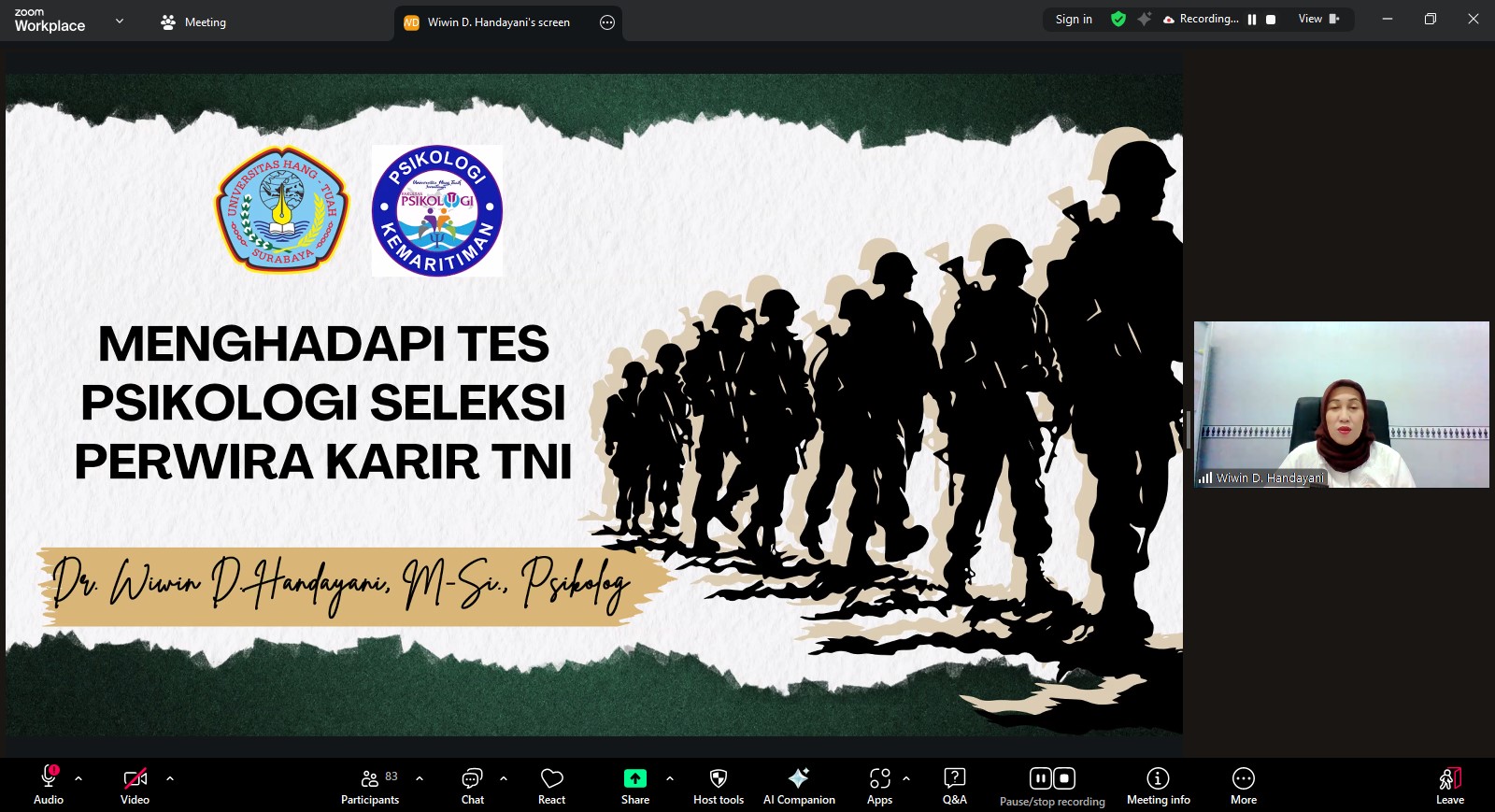 Pada hari Senin, tanggal 20 Oktober 2025, diadakan Webinar Pendampingan Intensive menghadapi Seleksi Perwira Prajurit Karir TNI bagi Mahasiswa dan Alumni UHT Tahun 2025 dengan  Nara Sumber Bapak Wakil Rektor III Dr. Toto Dwijaya Saputra, S.T., M.Si(Han)., M.Tr.Opsla., Dekan Psikologi, Dekan Psikologi Ibu Dr. Wiwin Dwi Handayani, M.Si., CHRMP., Psikolog., dekan Fakultas Vokasi Pelayaran Bapak Djamaludin Malik, S.E., M.A.P., M.Tr.Opsla., M.Mar. dan Lettu Laut(T) Muhammad Safrijal, ST Alumni Universitas Hang Tuah