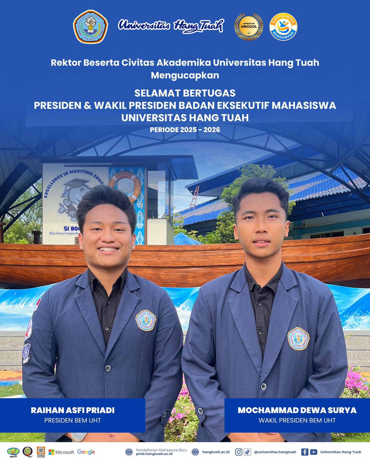Surabaya, 27 November 2025 – Universitas Hang Tuah (UHT) berhasil menggelar upacara Serah Terima Jabatan (Sertijab) dan Pelantikan Pengurus Organisasi Mahasiswa (Ormawa) masa bakti 2025/2026. Acara tersebut mencakup pengukuhan Badan Eksekutif Mahasiswa (BEM), Majelis Permusyawaratan Mahasiswa (MPM), Dewan Perwakilan Mahasiswa (DPM), dan Himpunan Mahasiswa Program Studi (HIMA). Upacara yang berlangsung khidmat ini dilaksanakan di Ruang Seminar Gedung Rektorat Lantai 2 Pulau Enggano, Universitas Hang Tuah, dan dihadiri oleh jajaran pimpinan universitas, termasuk Wakil Rektor I, Wakil Rektor III, serta para dekan dan pejabat utama UHT. Pengukuhan ini ditandai dengan penandatanganan Berita Acara Sertijab yang menandai pergantian kepemimpinan dari periode 2024/2025 ke 2025/2026. Adapun jabatan yang diserahterimakan adalah sebagai berikut: Presiden BEM: Dari Hamdan Arayyan Rochman kepada Raihan Asfi Priadi Ketua Umum MPM: Dari Hesty Ikesarweni Putri kepada Alief Hidayatullah.